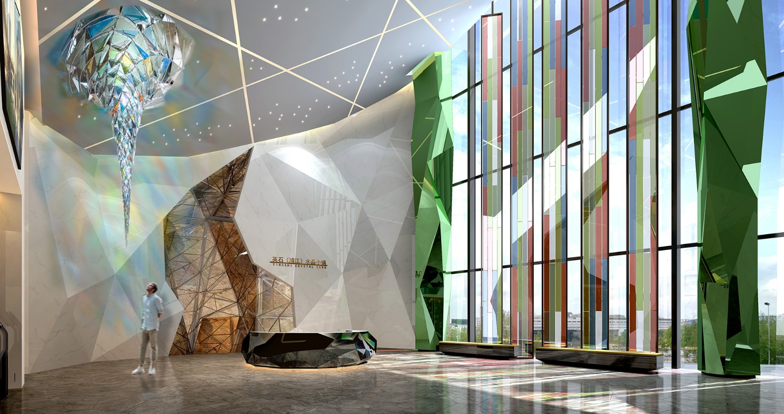 浦江是聞名遐邇的中國水晶之都,水晶小鎮是浦江水晶產業轉型升級的示范區,而小鎮客廳是水晶小鎮之旅的第一站和核心景觀。整個小鎮客廳集接待、洽談、體驗、展示、餐飲、娛樂、休閑等功能于一體,分為地下一層、地上二層,主要設有服務大廳、多功能廳(劇場)、水晶小鎮展示廳、水晶藝術館、DIY紀念館、水晶博物館、水晶小鎮未來科技體驗館、智能指揮中心、英石浦江(辦公室)以及其他配套設施。建筑總面積約13500平方米,設計總面積約12000平方米。