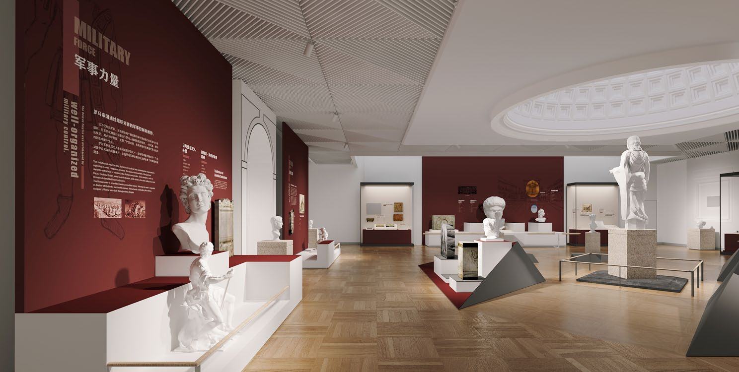 展廳運(yùn)用了紅、黃、白的色調(diào),鮮明區(qū)分展覽的敘述章節(jié);古羅馬建筑元素和AR實(shí)景互動帶領(lǐng)人們一秒穿越古羅馬,追溯“永恒之城”羅馬的起源發(fā)展,了解疆域廣闊的羅馬帝國如何輻射歐亞非文明的過程。