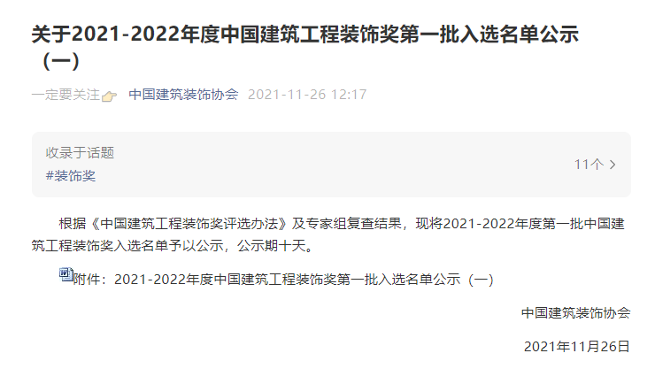 根據《中國建筑工程裝飾獎評選辦法》及專家組復查結果,中國建筑裝飾協會公示了2021-2022年度中國建筑工程裝飾獎第一批入選名單,金螳螂文化申報的江蘇省政府投資基金產業集聚區(A區)裝修改造工程獲選。