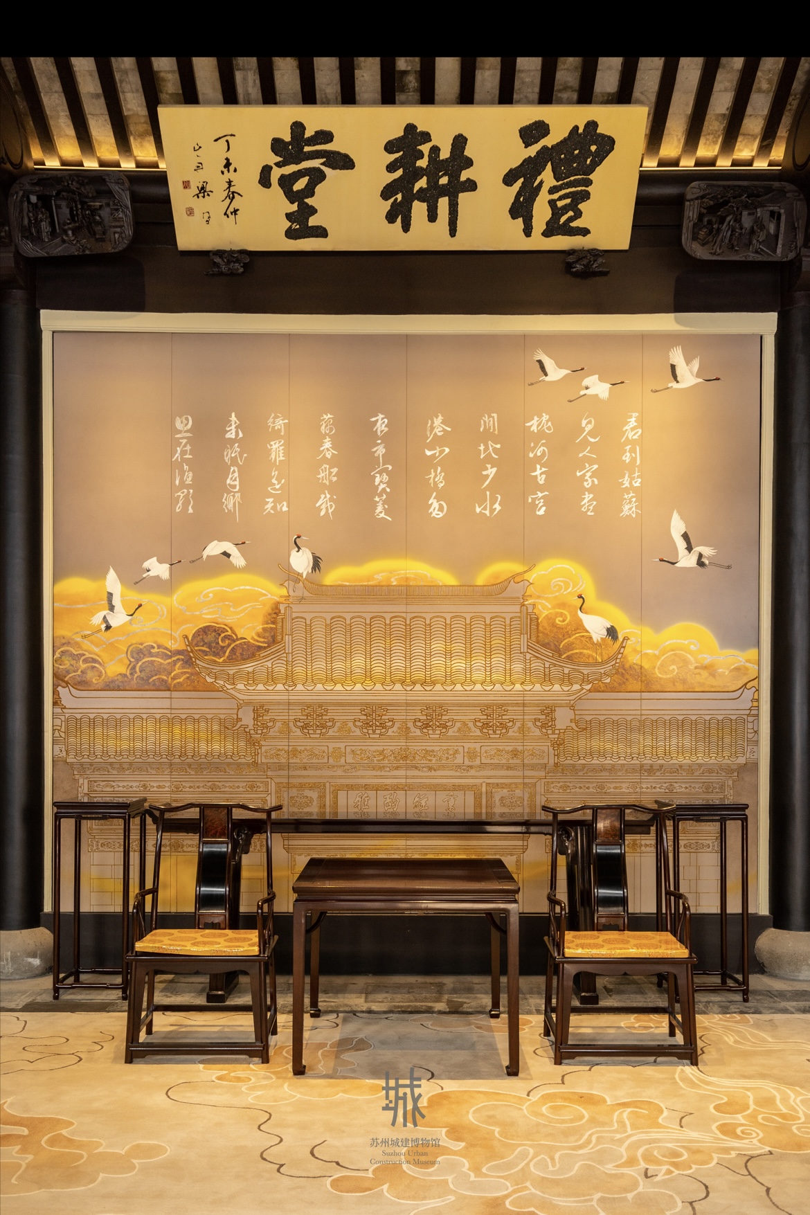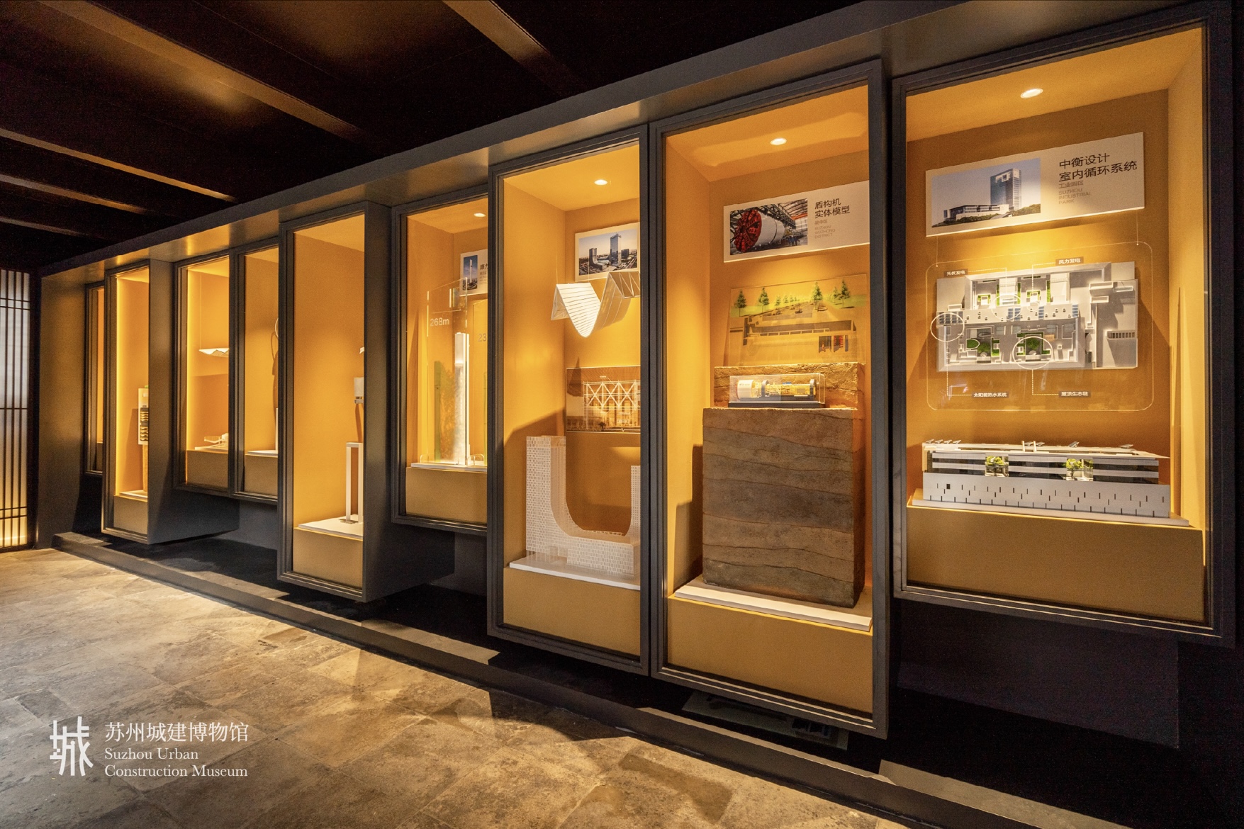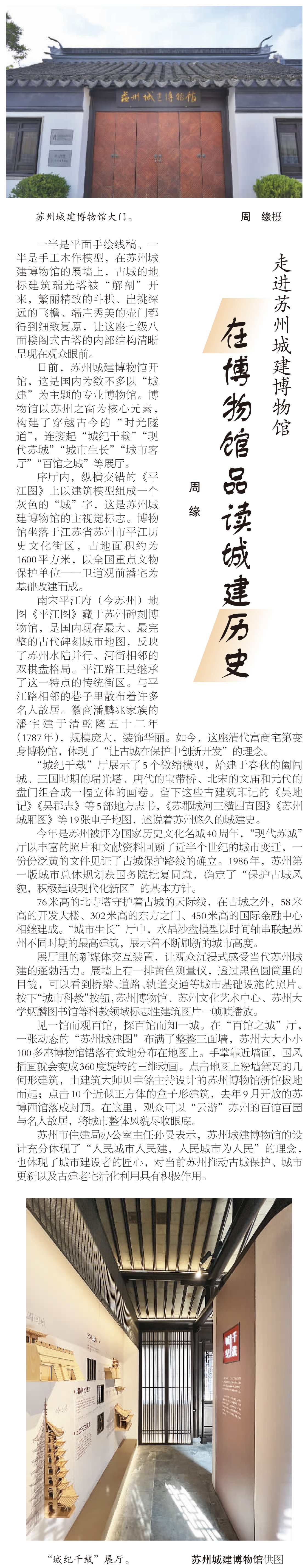 從小橋流水到繁華街市, 從亭臺樓閣到摩天大廈, 從限高24米的古城區(qū)出發(fā), 城市天際線不斷延伸, 蘇州城市發(fā)展的畫卷徐徐展開。 蘇州城建博物館邀您在平江古宅內(nèi), 縱覽姑蘇城市發(fā)展脈絡。 7月5日,《人民日報》(海外版)刊發(fā)文章《走進蘇州城建博物館——在博物館品讀城建歷史》,介紹蘇州城建博物館的立館初心、設計理念以及展陳內(nèi)容。 5月18日,蘇州城建博物館正式開館,這是國內(nèi)為數(shù)不多以“城建”為主題的專業(yè)博物館。 蘇州城建博物館坐落于江蘇省蘇州市平江歷史文化街區(qū),占地面積約為 1600 平方米,以全國重點文物保護單位——衛(wèi)道觀前潘宅為基礎改建而成。 南宋平江府 (今蘇州) 地圖 《平江圖》藏于蘇州碑刻博物館,是國內(nèi)現(xiàn)存最大、最完整的古代碑刻城市地圖,反映了蘇州水陸并行、河街相鄰的雙棋盤格局。 平江路正是繼承了這一特點的傳統(tǒng)街區(qū)。與平江路相鄰的巷子里散布著許多名人故居。徽商潘麟兆家族的潘宅建于清乾隆五十二年(1787年),規(guī)模龐大,裝飾華麗。如今,這座清代富商宅第變身博物館,體現(xiàn)了“讓古城在保護中創(chuàng)新開發(fā)”的理念。 以蘇州之窗為核心元素,蘇州城建博物館構(gòu)建了穿越古今的“時光隧道”,連接起“城紀千載”“現(xiàn)代蘇城”“ 城市生長”“城市客廳”“百館之城”等展廳。 步入序廳,墻壁上由平江圖縱橫阡陌的街巷格局衍化而來的城建博物館LOGO映入眼簾,以及極具意蘊的序言,營造出一種古色古香、厚重深廣的第一視覺印象。 一半是平面手繪線稿、一半是手工木作模型,城紀千載廳,古城的地標建筑瑞光塔被“解剖”開來,繁麗精致的斗栱、出挑深遠的飛檐、端莊秀美的壺門都得到細致復原,讓這座七級八面樓閣式古塔的內(nèi)部結(jié)構(gòu)清晰呈現(xiàn)在觀眾眼前。 源浚者流長,根深者葉茂。一個城市的歷史遺跡、文化古跡、人文底蘊,是城市生命的一部分。現(xiàn)代蘇城廳以文物陳列結(jié)合影像記錄的方式,講述蘇州近現(xiàn)代城建改造與保護的故事。呈現(xiàn)蘇州歷代城建人在老城區(qū)改造的同時,也在有意識、有目的的保護歷史遺跡、改善人居環(huán)境,延續(xù)城市文脈,使歷史故居和當代建筑相得益彰。 城市生長廳以影像采訪和榮譽陳列的形式,記載了為現(xiàn)代蘇城建設貢獻智慧與辛勞的勞模與集體。而地下管廊、建筑屋頂、抗風避震這樣的微創(chuàng)新技術(shù)縮模型則體現(xiàn)著蘇州城市建設中的當代智慧。 從1986年建成的開發(fā)大樓開始,一座座現(xiàn)代高樓拔地而起。城市生長廳正中以“城市生長”的互動展項串聯(lián)起蘇州不同時期的最高建筑,不斷升高的建筑天際線也象征了蘇州城市不斷發(fā)展的新高度。 城市會客廳整體保留了潘宅正廳——禮耕堂的建筑格局,抬頭可為清代四大書法家之一的梁同書所書的“禮耕堂”三字。 中堂設計以潘宅磚雕門頭為原型,借用唐代杜荀詩句鶴送人游吳,集字唐寅書法,采用漆畫工藝制作。整個大廳結(jié)構(gòu)規(guī)整,氣勢恢宏,為清乾隆時期具有代表性的建筑作品。一磚一瓦,一草一木,觸手可及三百年的滄桑變換。 一灣碧水護城安,兩岸美景入畫來。百館之城廳是一張可以通過觸摸交互觸發(fā)的手繪版“現(xiàn)代蘇州城建圖”,蘇州現(xiàn)存的103座博物館、169處市級控保建筑、65處各級文保單位,在這里,可以通過觸摸來感知深厚的蘇城的厚重歷史。 “城市”是一個大型的人類聚居地,是承載人類進步和發(fā)展的載體,是人類文明的鮮明標志,讓城市生活更美好,是城市建設、發(fā)展、治理的價值所在。 方寸之間,匯聚蘇州城建縮影。“人民城市人民建,人民城市為人民”,城建博物館是蘇州城建文化價值的縮影,承載著蘇州過去的厚重歷史,匯聚著對蘇州未來發(fā)展的美好愿景,將成為蘇州城建精神風貌的展示窗口與文化地標。