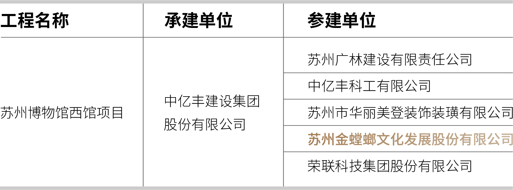 近日 中國建筑業協會公示 2022-2023年度第二批 中國建設工程魯班獎(國家優質工程) 入選名單 金螳螂文化匠心打造的項目 蘇州博物館西館 榜上有名 “魯班獎”是中國建筑行業 工程質量最高榮譽獎項 是建筑行業領域的“奧斯卡” 代表了我國當前工程建設質量的最高水平 金螳螂文化再次獲得 “魯班獎” 是項目團隊高標準嚴要求的實踐注解 也是企業匠心質造的最佳映證 蘇州博物館西館位于江蘇省蘇州市高新區獅子山下,展陳面積13391平方米。 作為蘇州博物館的重要組成部分,蘇州博物館本館與西館,一傳統,一當代;一江南,一國際;一重觀展,一重體驗。兩館錯位發展,彰顯著蘇州博物館“代表江南文化、創新發展和引領行業發展的一流的世界級博物館”的發展理念。 “純粹江南 技憶蘇州——蘇州博物館西館基本陳列”展覽包括“純粹江南”與“技憶蘇州”兩個部分,圍繞如何解讀作為江南核心的蘇州,以一萬年蘇州歷史和一千年蘇作工藝為主題,講述蘇州故事,展示蘇作匠心。 由金螳螂文化設計打造的“純粹江南 · 蘇州歷史陳列”是蘇州地區首個通史陳列,用1200余件/套文物,講述蘇州萬年文明史、兩千五百年城市史,溯源蘇州文脈傳承和地域文化發展。 以此次榮獲“魯班獎”為契機 金螳螂文化將 不斷追求卓越品質 提煉“真金” 助力文化展示行業的高質量發展 精益求精,再創佳績 向光而行,共赴熱愛
